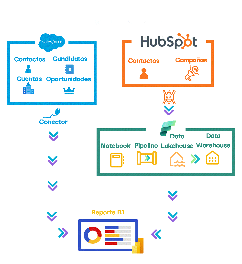 Para resolver esto, diseñé un flujo de datos que conectara ambos sistemas y los almacenara en un Lakehouse en Microsoft Fabric. 🏗️🔗